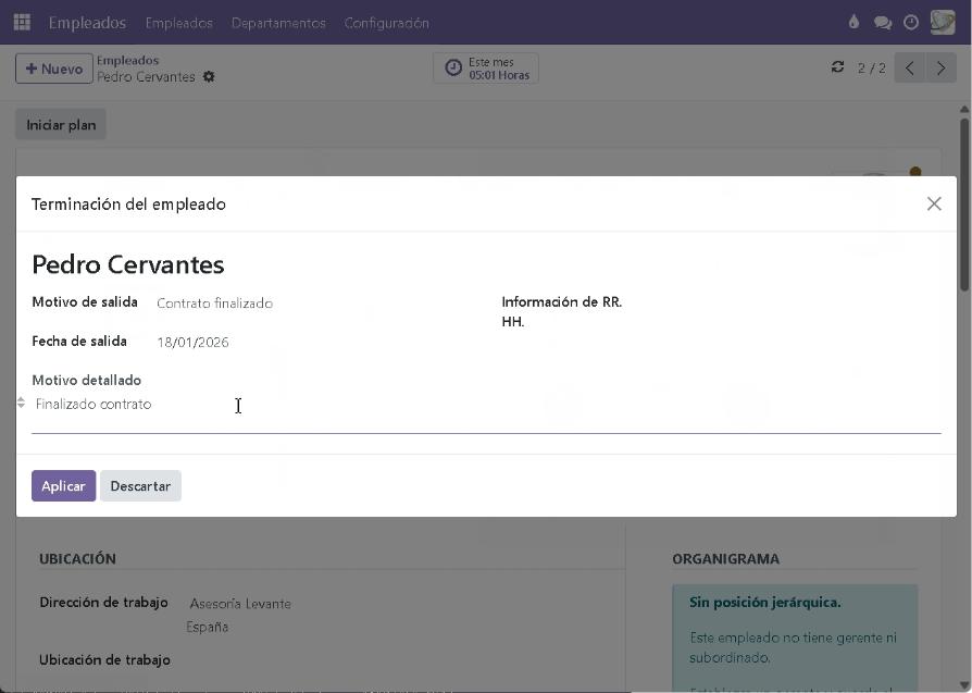 - Motivo de salida = Seleccione un motivo: Despedido, Contrato finalizado, ...